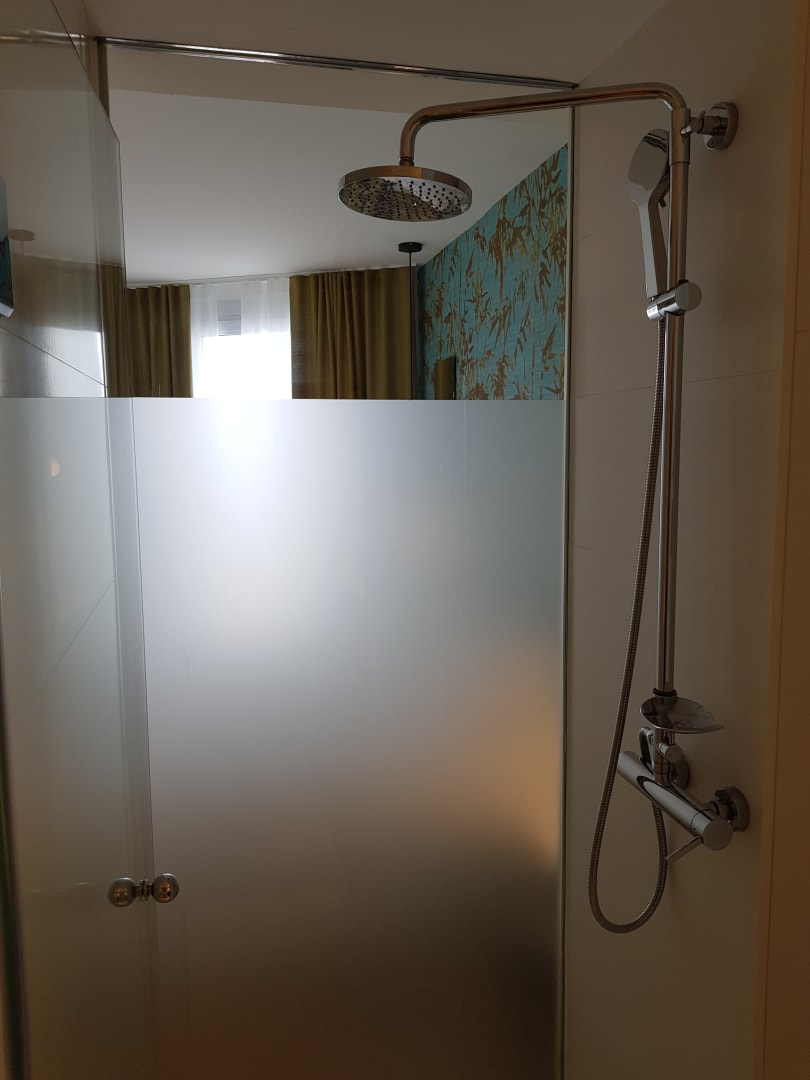 Dusche mit Milchglas zum Bett hin