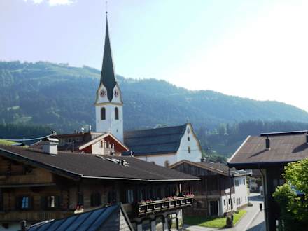 Blick vom Balkon auf Dorf und Kirche
