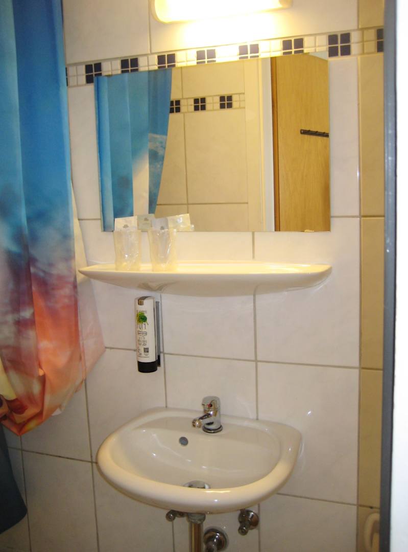 Blick ins Bad (Spiegelung im Spiegel). LInks die Dusche.