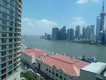 Ausblick auf den zweiten Turm des Hotels (links) und über den Huangpu-Fluss nach Pudong (rechts)