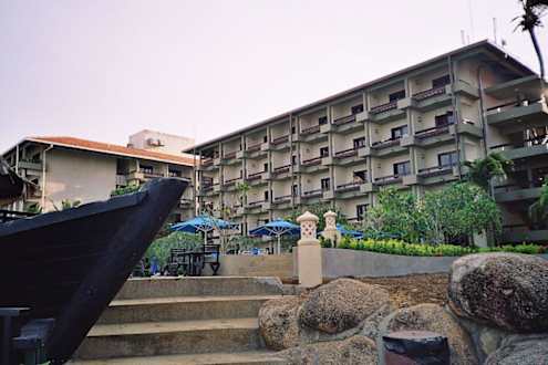 So sieht das Hotel von Pool und Strand gesehen aus.