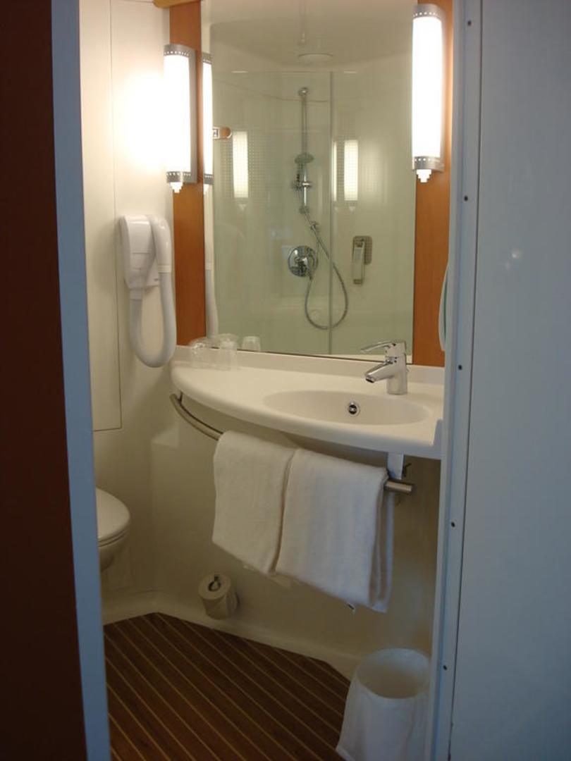 Das Bad in Form einer Kabine mit WC, Dusche, Waschbecken.