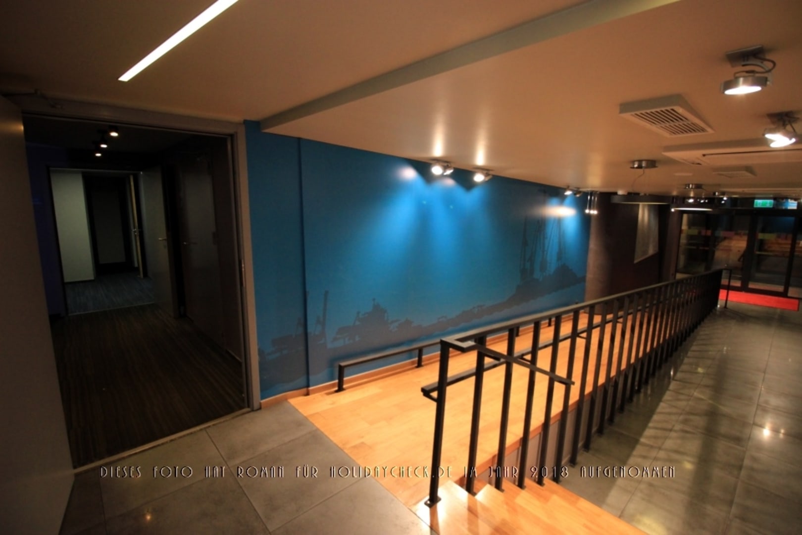 LobbyBlick auf die Rampe zwischen Hoteleingang und dem Zugang zu den beiden Lifts.