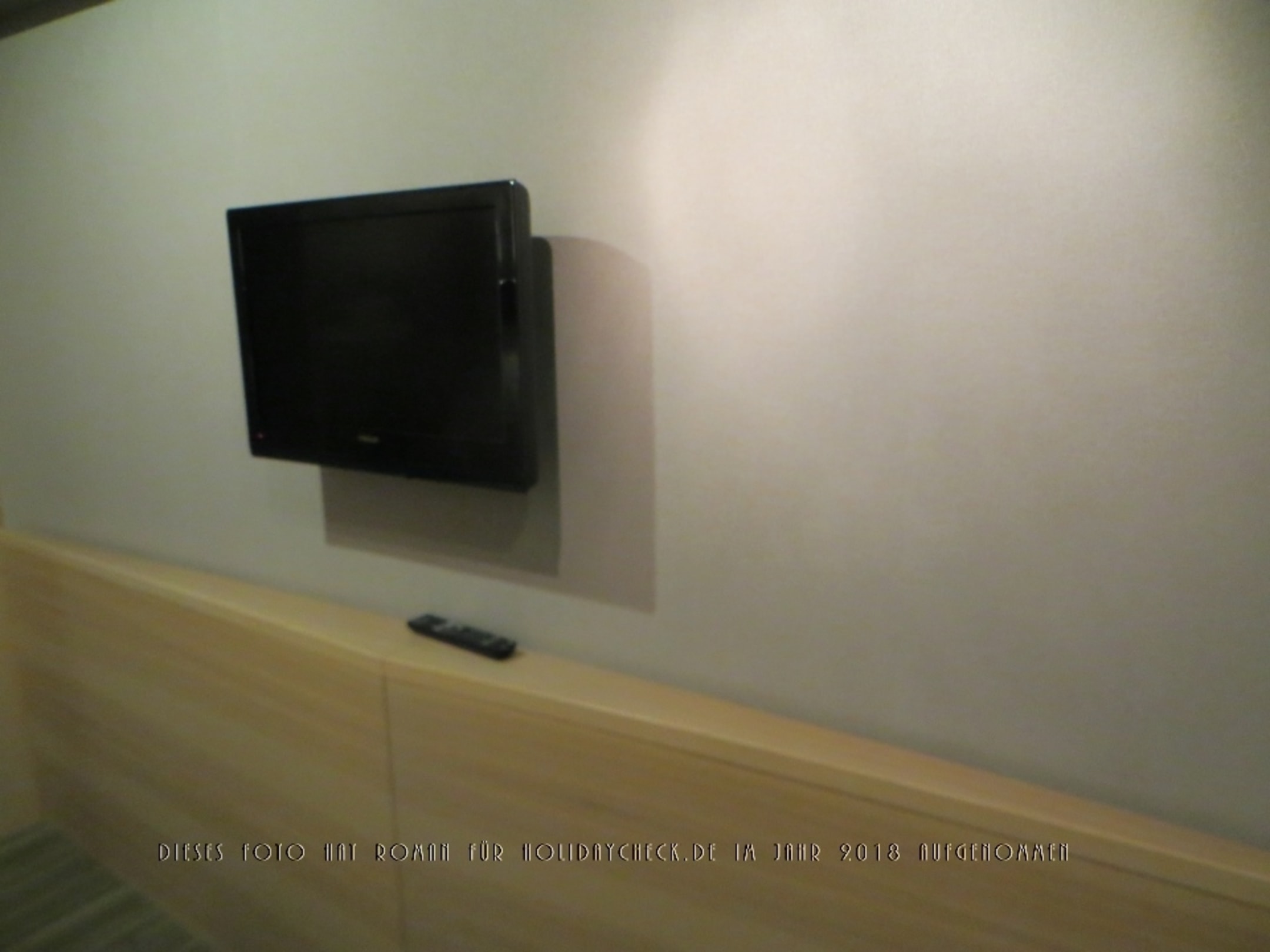 Nächtlicher Anblick der jenseits der Fußseite der Einzelbetten auf den an der Wand angebrachten Flachbild-TV, darunter die Fernbedienung liegend.