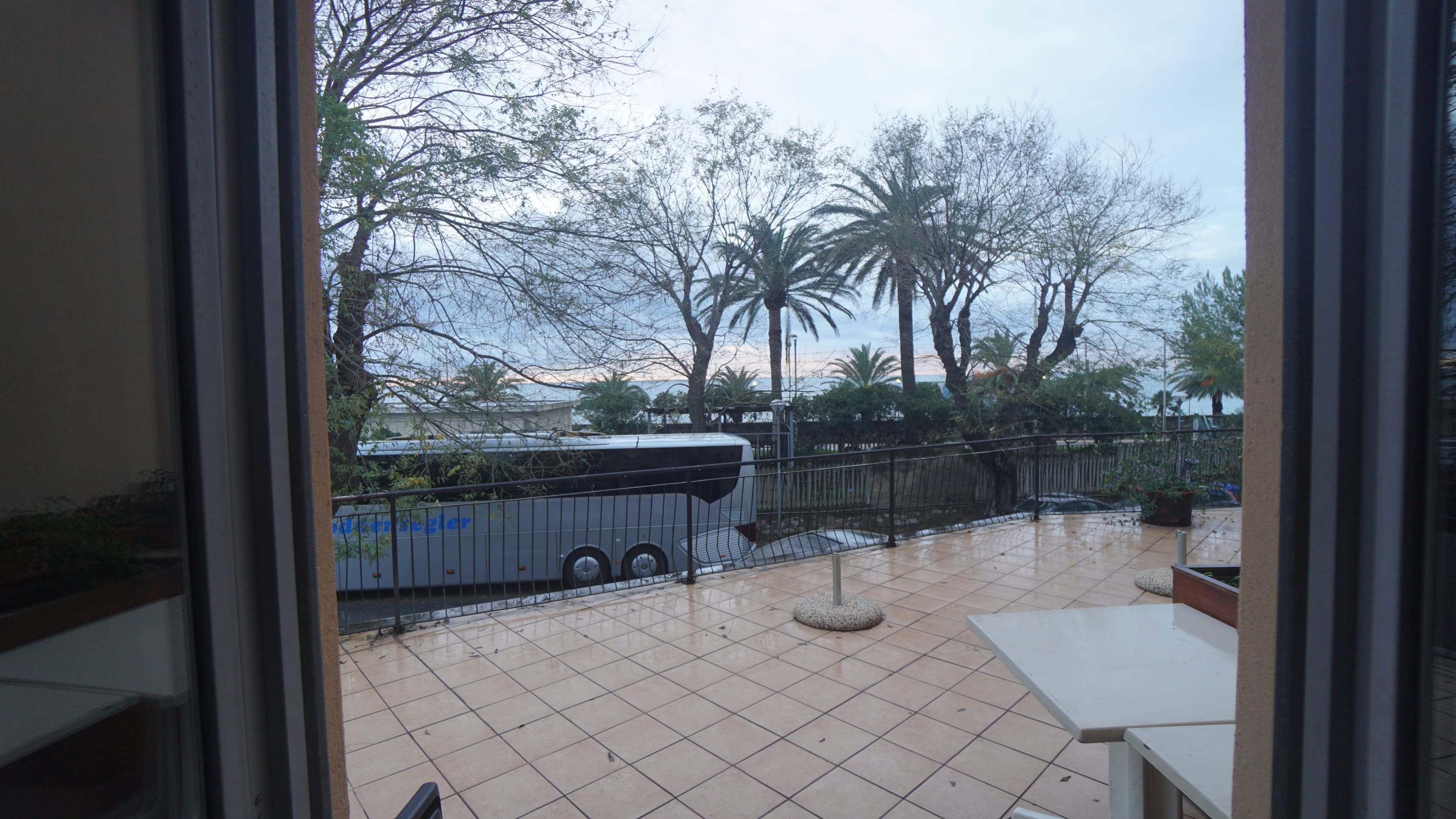 Unsere Terrasse - Blick aus der Terrassentür auf das Meer (hinter/über der Straße)
