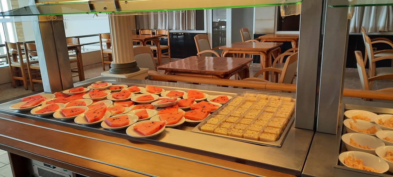 GastroNachspeisenbuffet zur Mittagszeit mit Melone und Kuchen vor dem großen Run, sehr saubere Tische und gemütliche Stühle