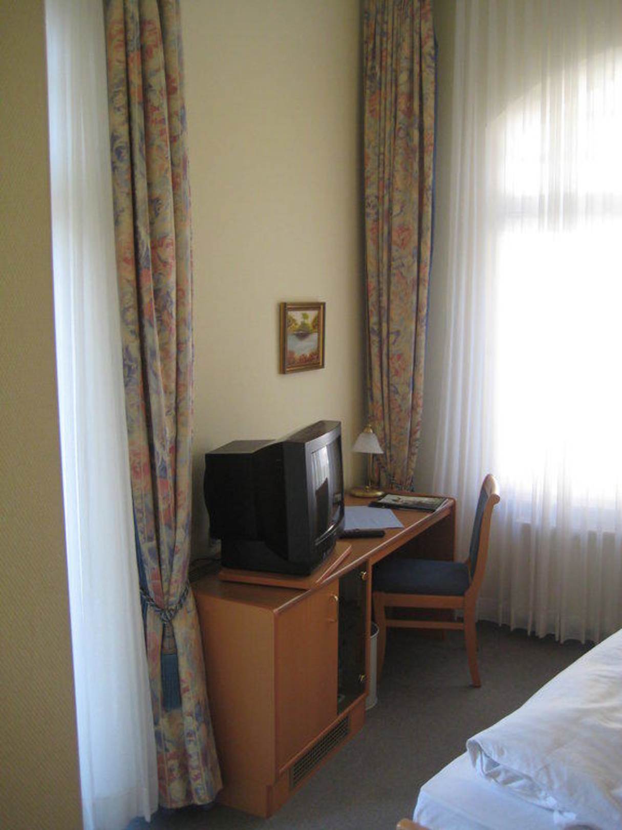 Blick auf den Schreibtisch mit TV und Stuhl
