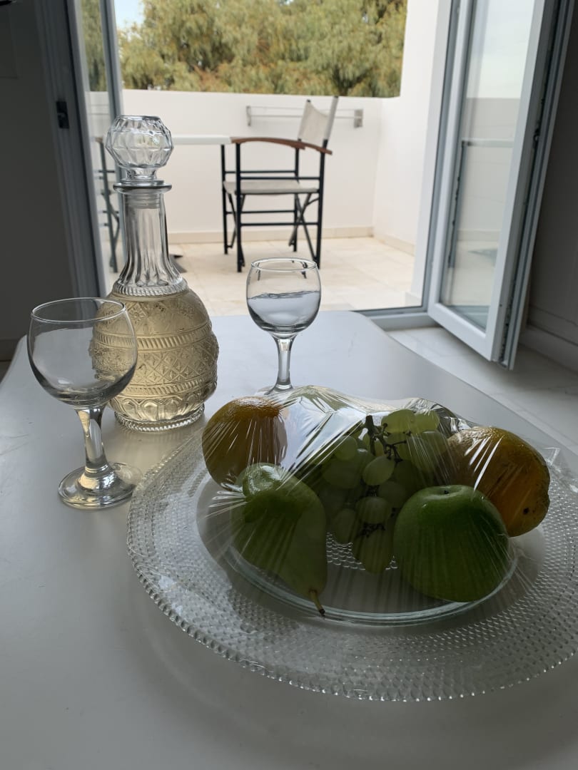 Griechischer Wein und Obst im Zimmer