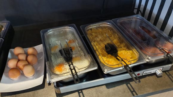 warmes Frühstück: gekochte Eier, Spiegeleier, Rührei und Speck