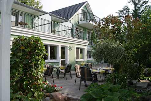 Auf dem Bild sieht man den schönen grünen Garten mit der Frühstücksterrasse