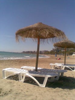 Schöner Sandstrand; Liegen kosten 6,00 EUR/Tag (Punkt 18.00 Uhr ist Feierabend!).