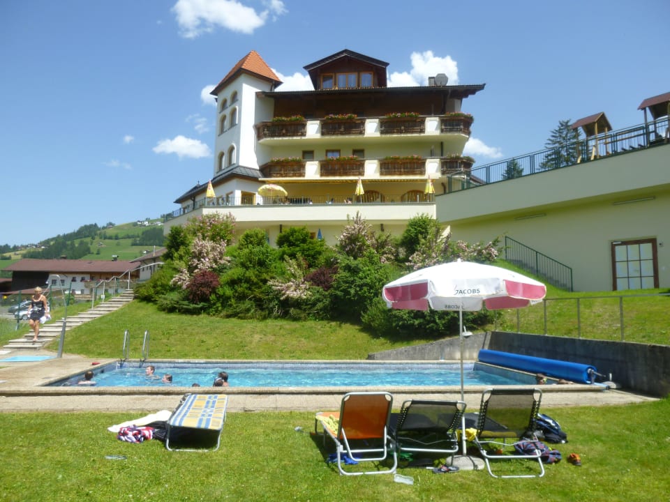 Ansicht aus Westen, Pool und Hotelterrasse.