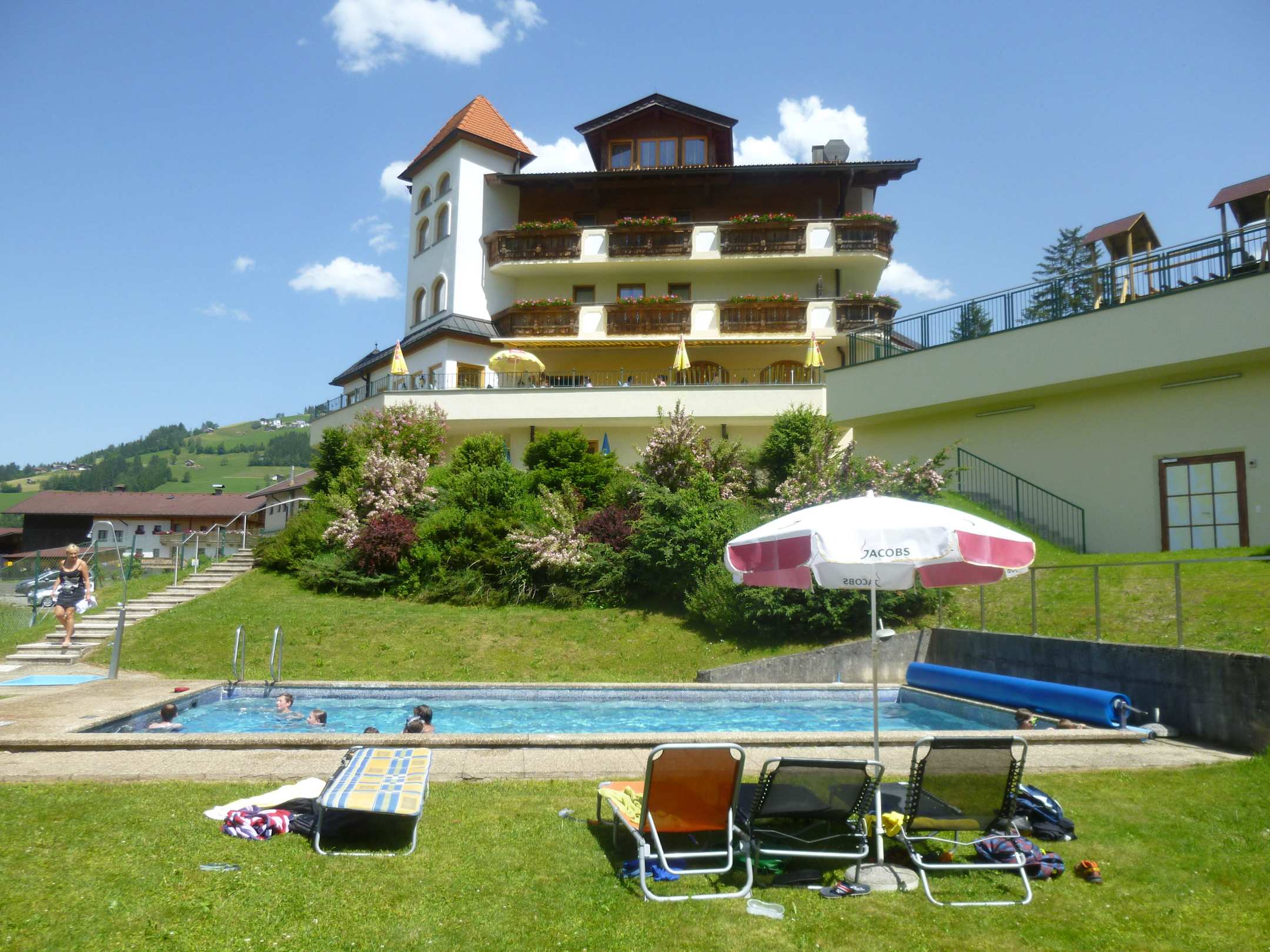 Im vorderen Teil des Bildes ist der Pool und die Liegewiese. Weiter oben die Terrasse, mit herrlicher Bergsicht für Essen, Kaffee, etc.