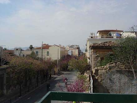 Blick vom Balkon unseres Zimmers hinunter zur Assomaton Straße
