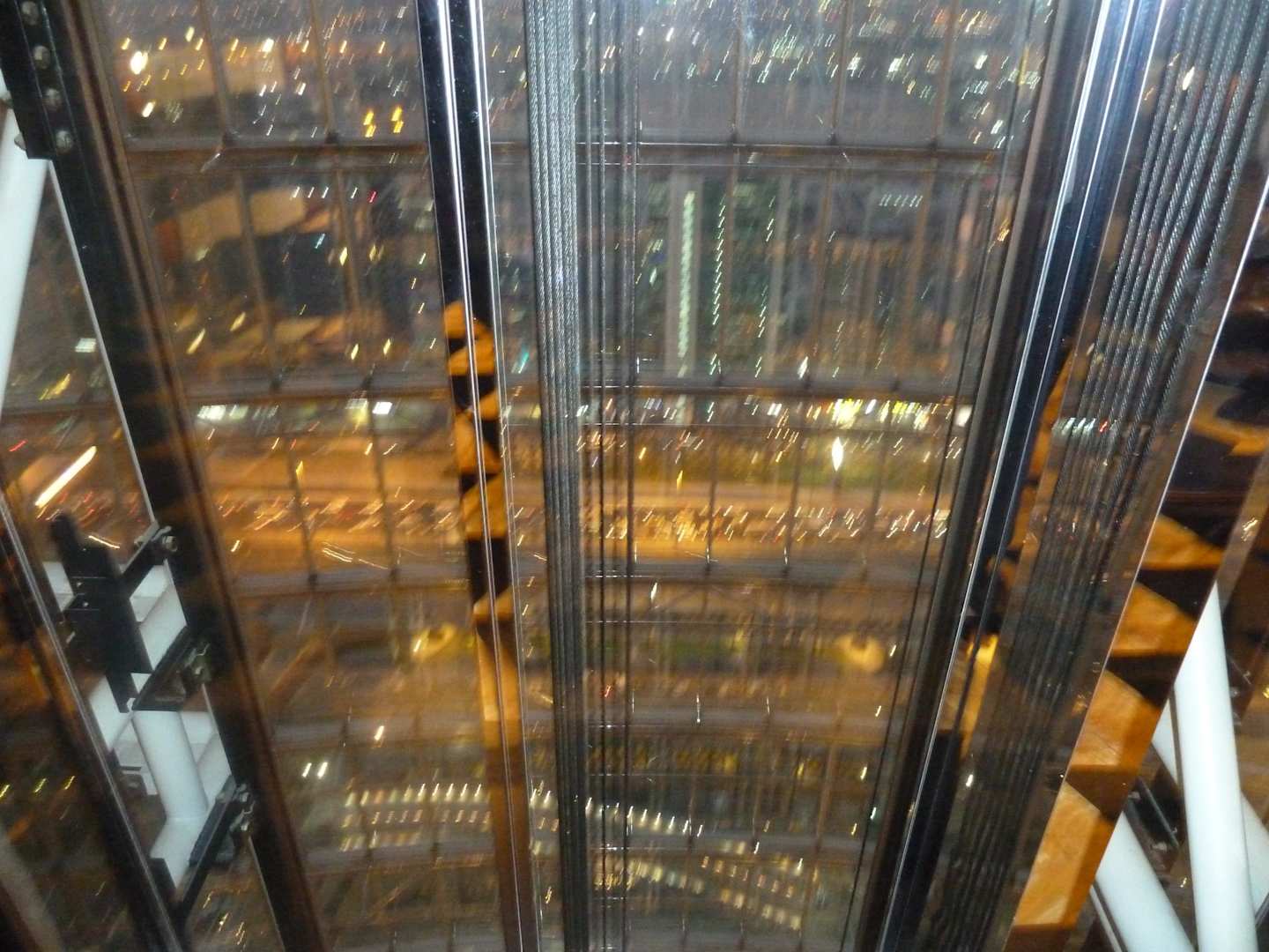 Fahrt mit dem Aufzug aus dem 40. Stock nach unten Wenn man mit dem gläsernen Aufzug nach unten fährt, sieht man auf die Stadt. Super Ausblick
