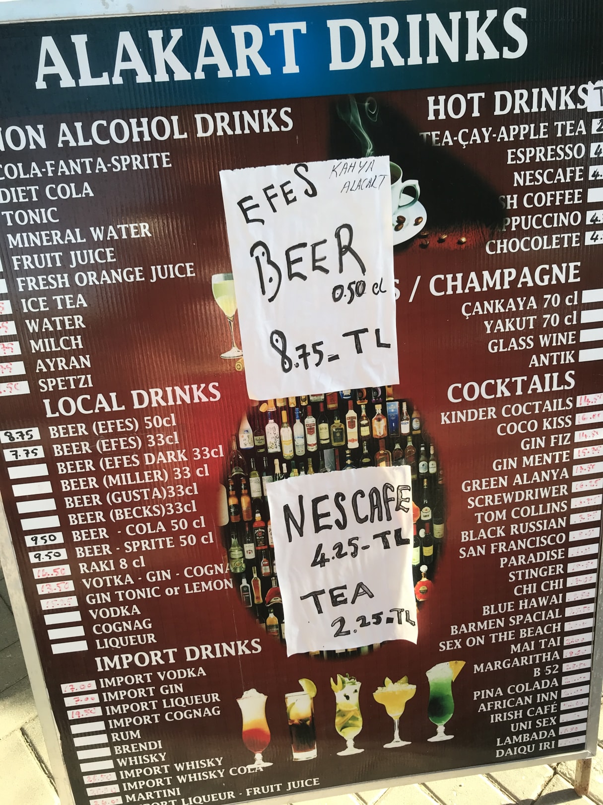 Dieses Schild steht draussen vorm Khaya Hotel Setzt man sich in die Raucherecke, um Bekannte zu besuchen, und bestellt ein Efes Bier, kostet es 12-13 Lira.