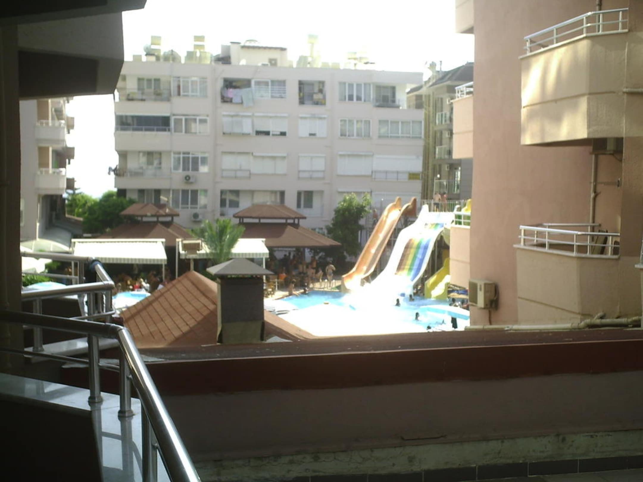 Ausblick vom Balkonrechts sieht man das andere Gebäude des Hotels in der mitte den Pool mit den 3 Rutschen wobei die orangene nicht an war.