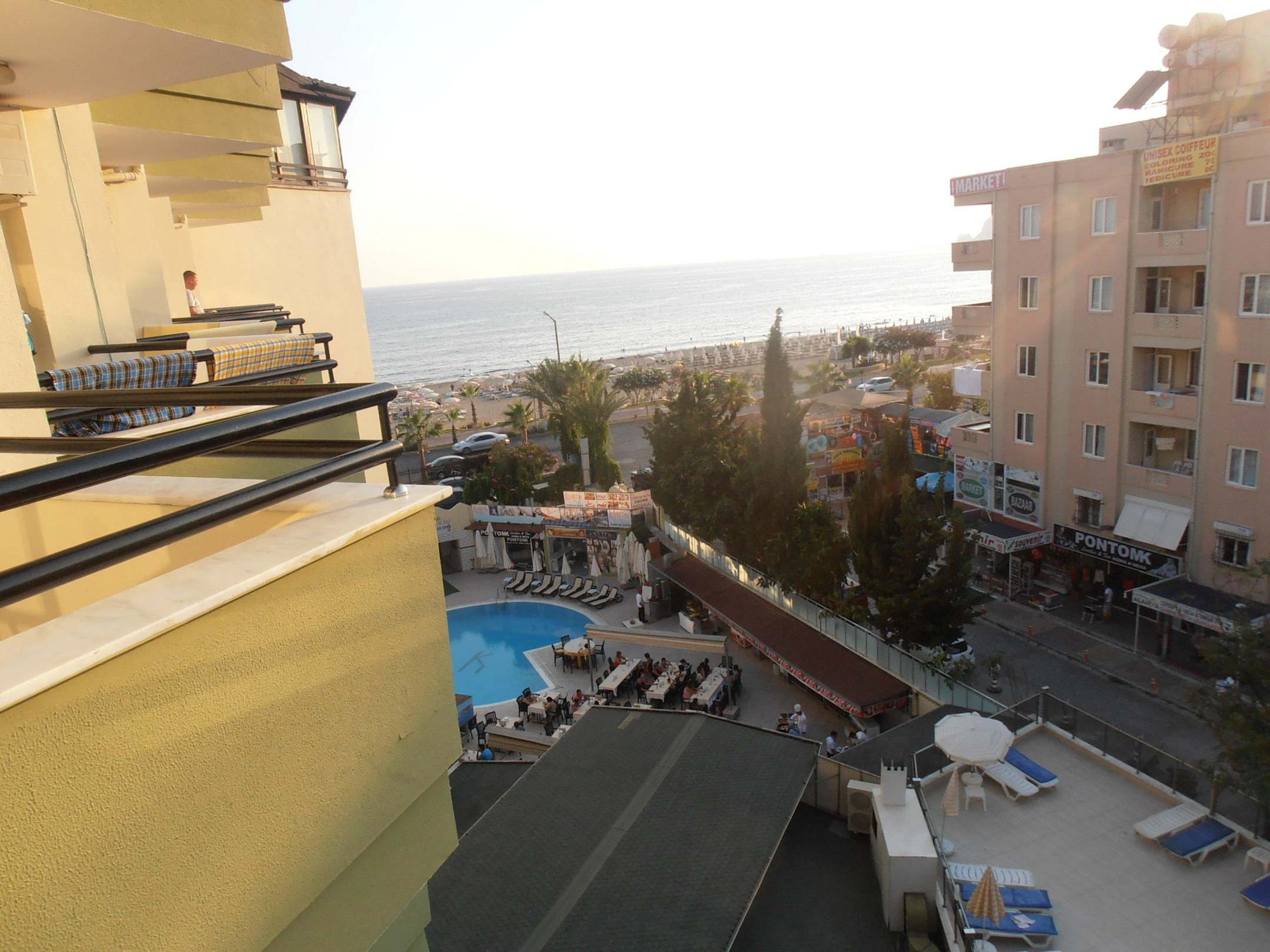 Výhled z hotelového pokoje na moře, vedlejší hotel