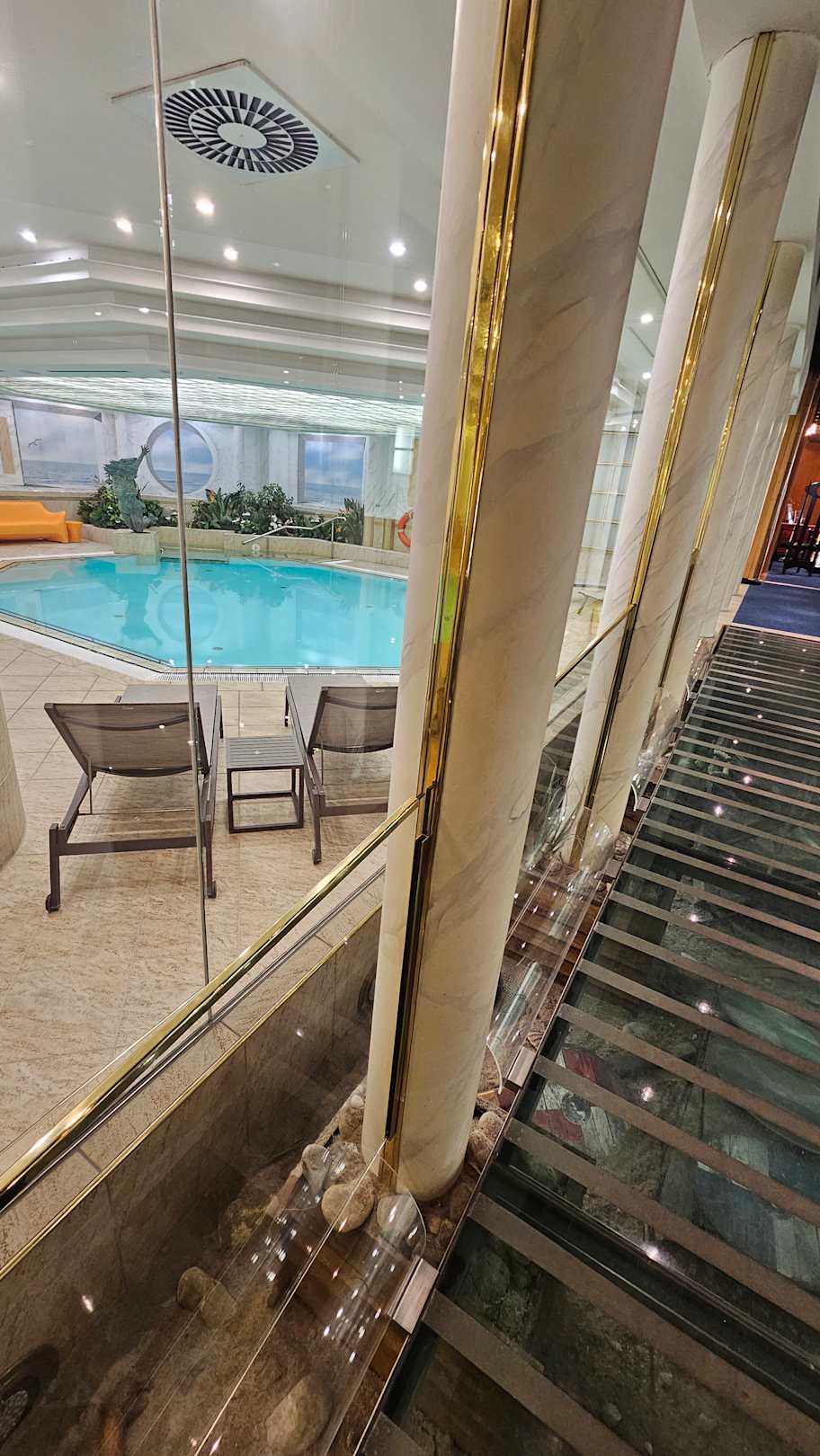 ""Poollandschaft "" mit Steg wo Hotelgäste mit ihren Koffern vorbei fahren oder andere