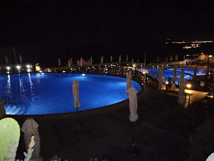Blick vom Restaurant auf den Pool Richtung Therme bei Nacht