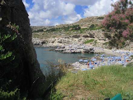 der etwas felsige Badestrand mit den blau-weißen Schirmen, einfach einladend
