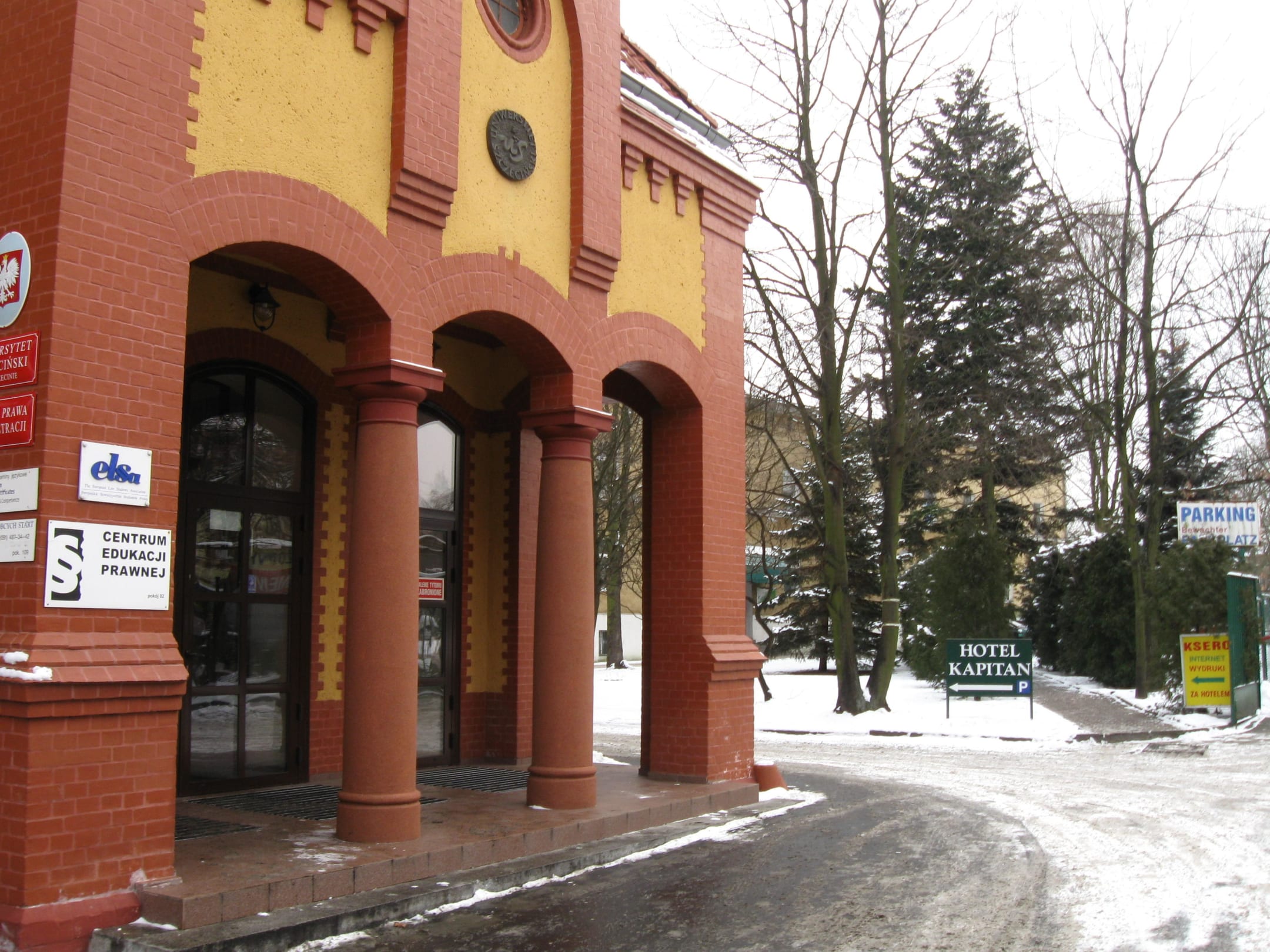 Das rote Gebäude gehört zur Universität (Registrationsbüro) und steht direkt an der ul. Narutowica - Hausnummer 17A. Das Hotel befindet sich dahinter - Hausnummer 17B.
