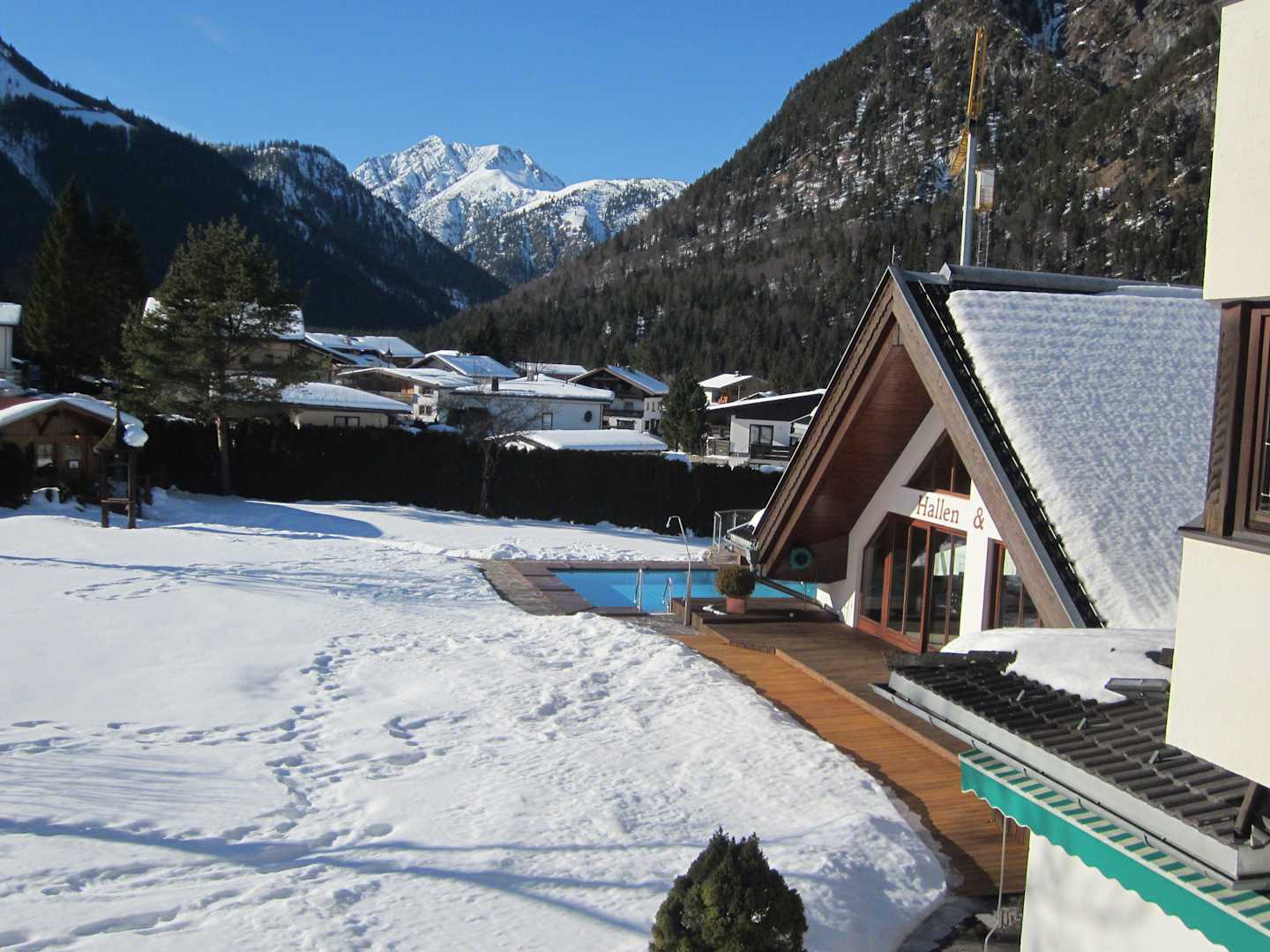Außenpool und Blockhaus-Sauna (links im Bild)