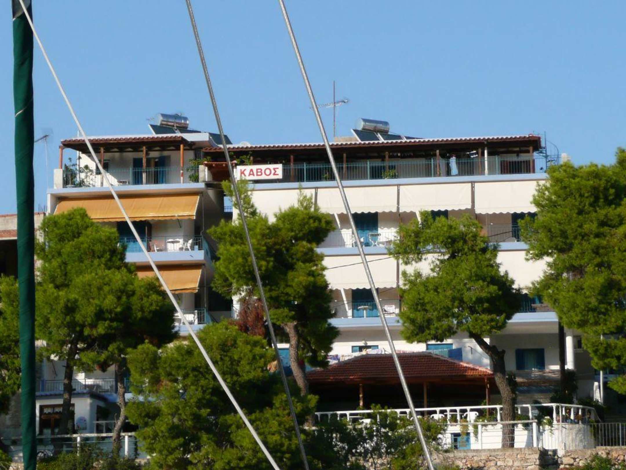Blick auf das Hotel vom Hafen ausAuf dem östlichen Kavos- Hügel gelegen, bietet das Hotel einen traumhaften Blick über die Bucht von Patitiri.