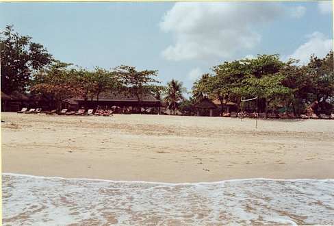 Vom Wasser auf den Strand und das Restaurant vor dem Hotel fotographiert.
