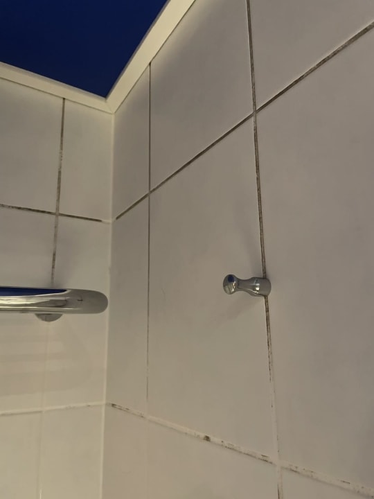 ZimmerBadezimmer, die Fugen hinter den Handtuchhaltern sind verschimmelt. Hier möchte ich kein Handtuch aufhängen!