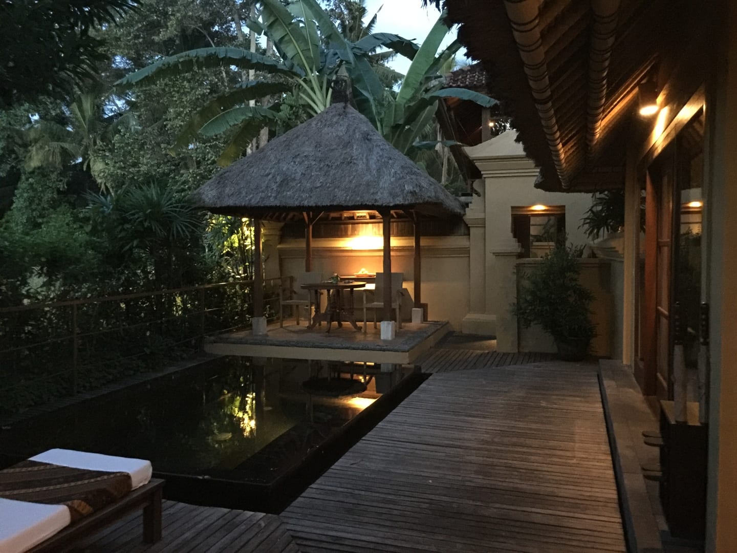Der große Terrassenbereich mit Swimmingpool und zwei Sonnenliegen sowie der Pavillion mit Tisch und Stühlen und Blick über die Reisfelder gehörten zur Suite. Den Zugang hierzu konnte man durch eine zweiflüglige Holztür sperren.
