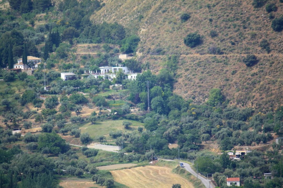 Hotel samt Garten in der Bildmitte u. links davon; das Foto wurde von den Bergen der gegenüberliegenden Seite aufgenommen und stark gezoomt