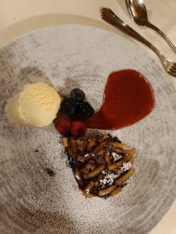 Dessert Apfelbrownies mit Vanilleeis und Himbeer-Spiegel