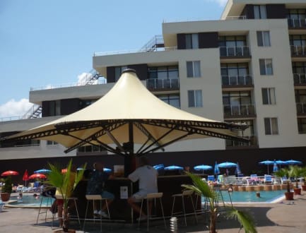 Sonnenschirm vorm Pool.