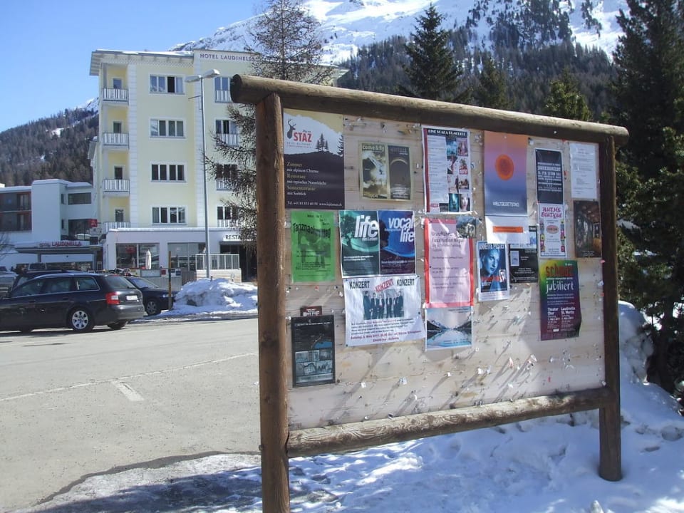 Anzeigentafel am Platz vor dem Hotel Laudinella Hotel Laudinella