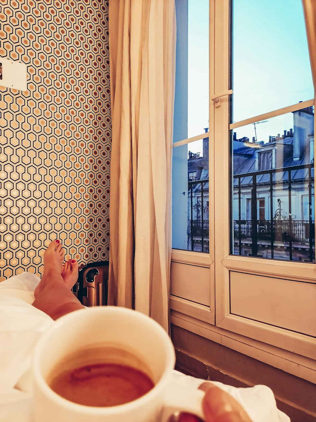Blick vom Bett auf den Balkon mit Aussicht