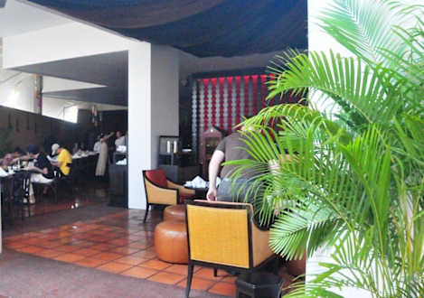 Blick vom Pool ins Restaurant