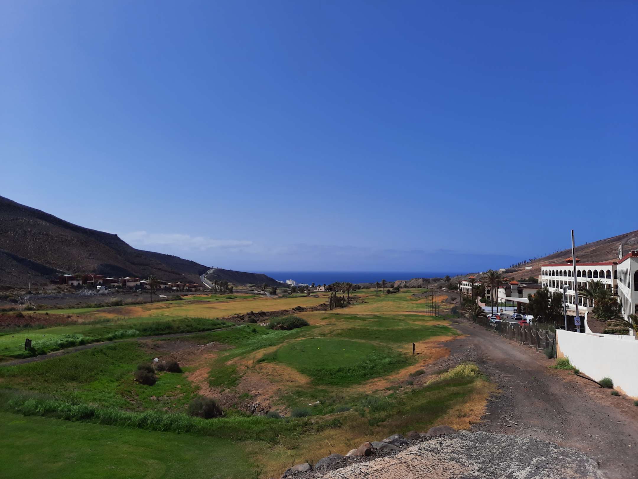 Links der Golfplatz. Rechts die Hotelanlage. Blick aufs Meer.