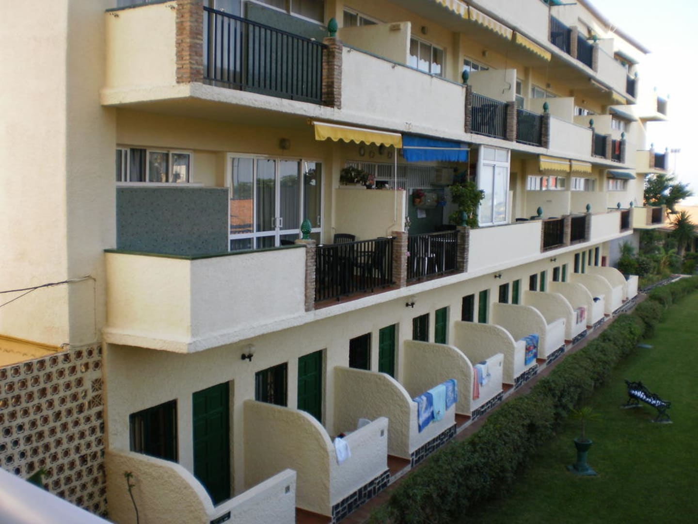 unser Blick vom Haupthaus auf die Zimmer mit Terrasse die nur ein Zimmer nach draußen hatten ansonsten innenliegend und dunkel und darüber Appartements