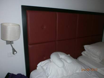 Die Rückenlehne des Doppelbettes war mit Leder bezogen.