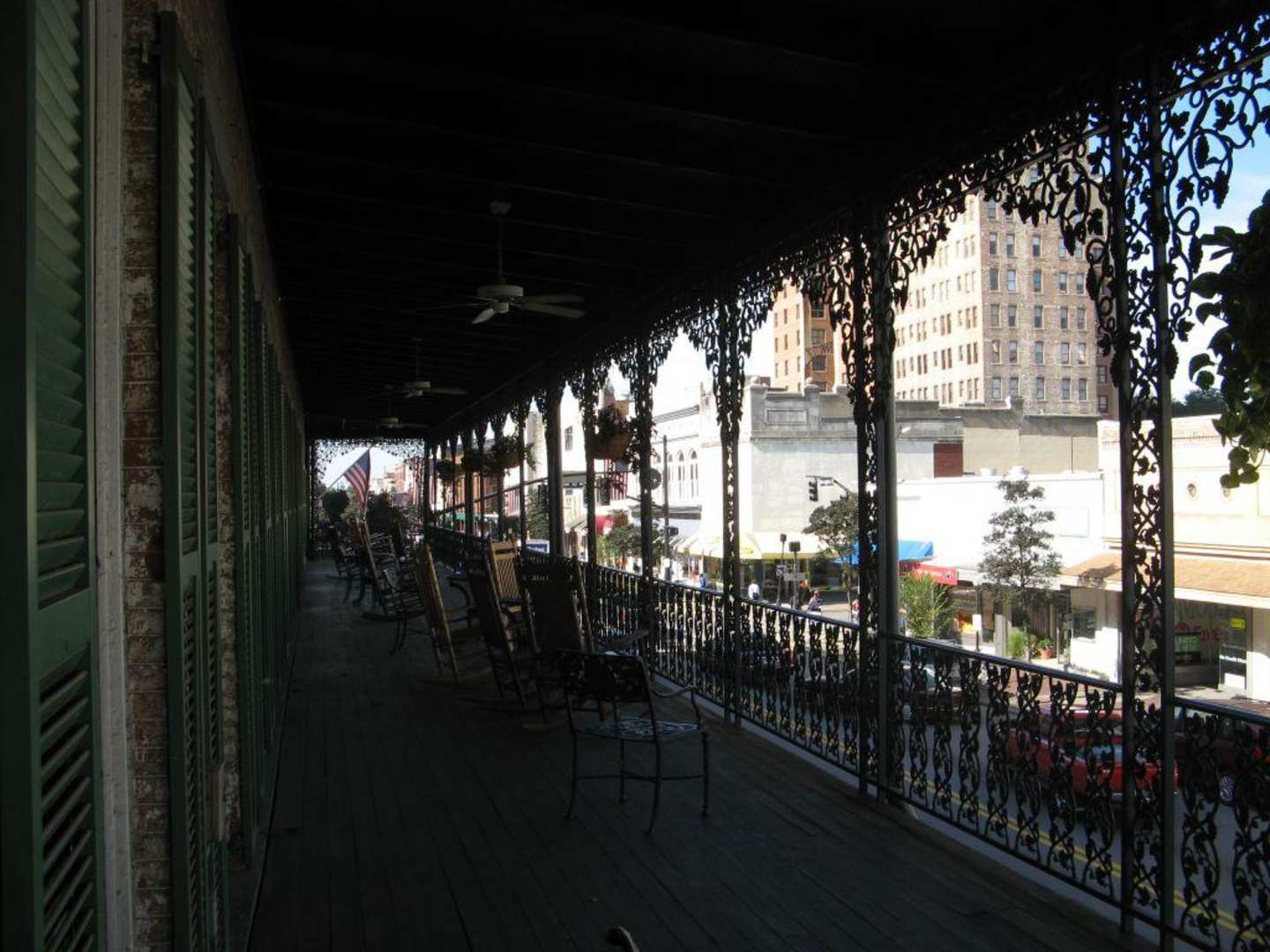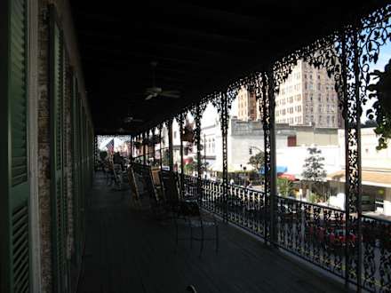 Marshall House in Savannah, Georgia: einige wenige Zimmer haben Zugang zu diesem Gemeinschaftsbalkon (man muß aus dem Fenster klettern, um auf den Balkon zu gelangen)