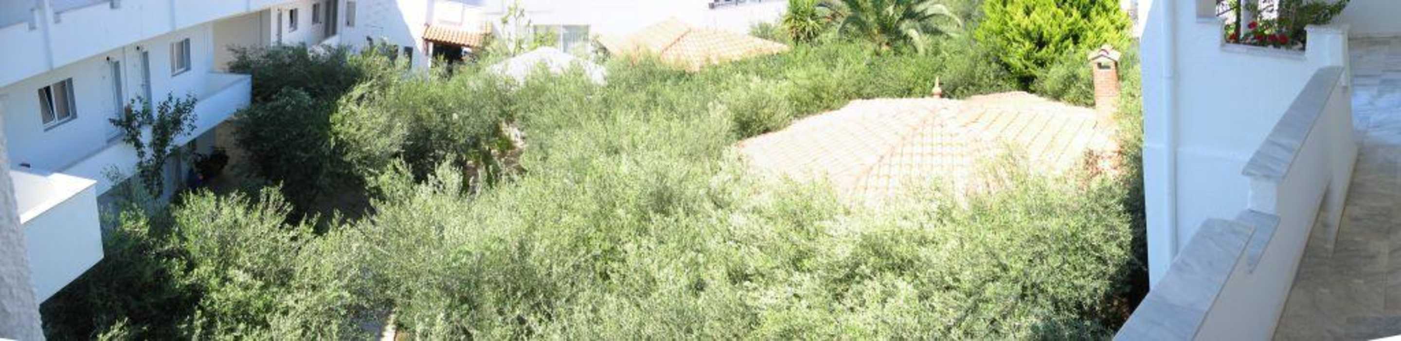 Blick vom 2. Stock auf den Innenhof mit Olivenbäumen