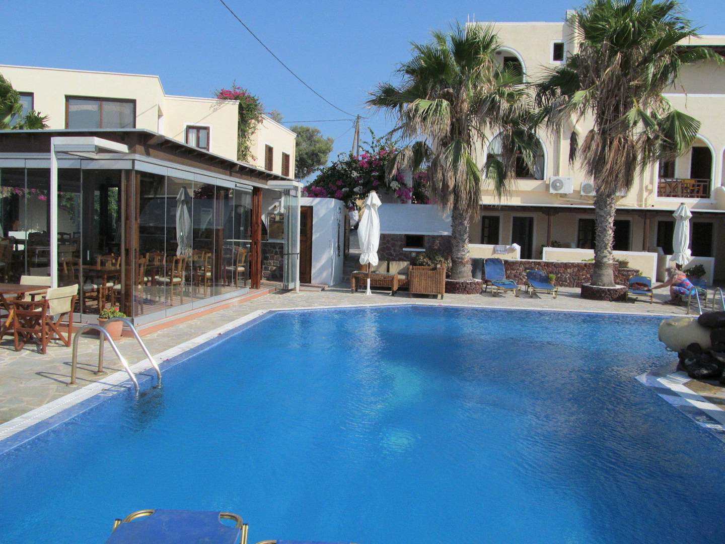 Hauptgebäude und Restaurant, zwischen beiden Pools