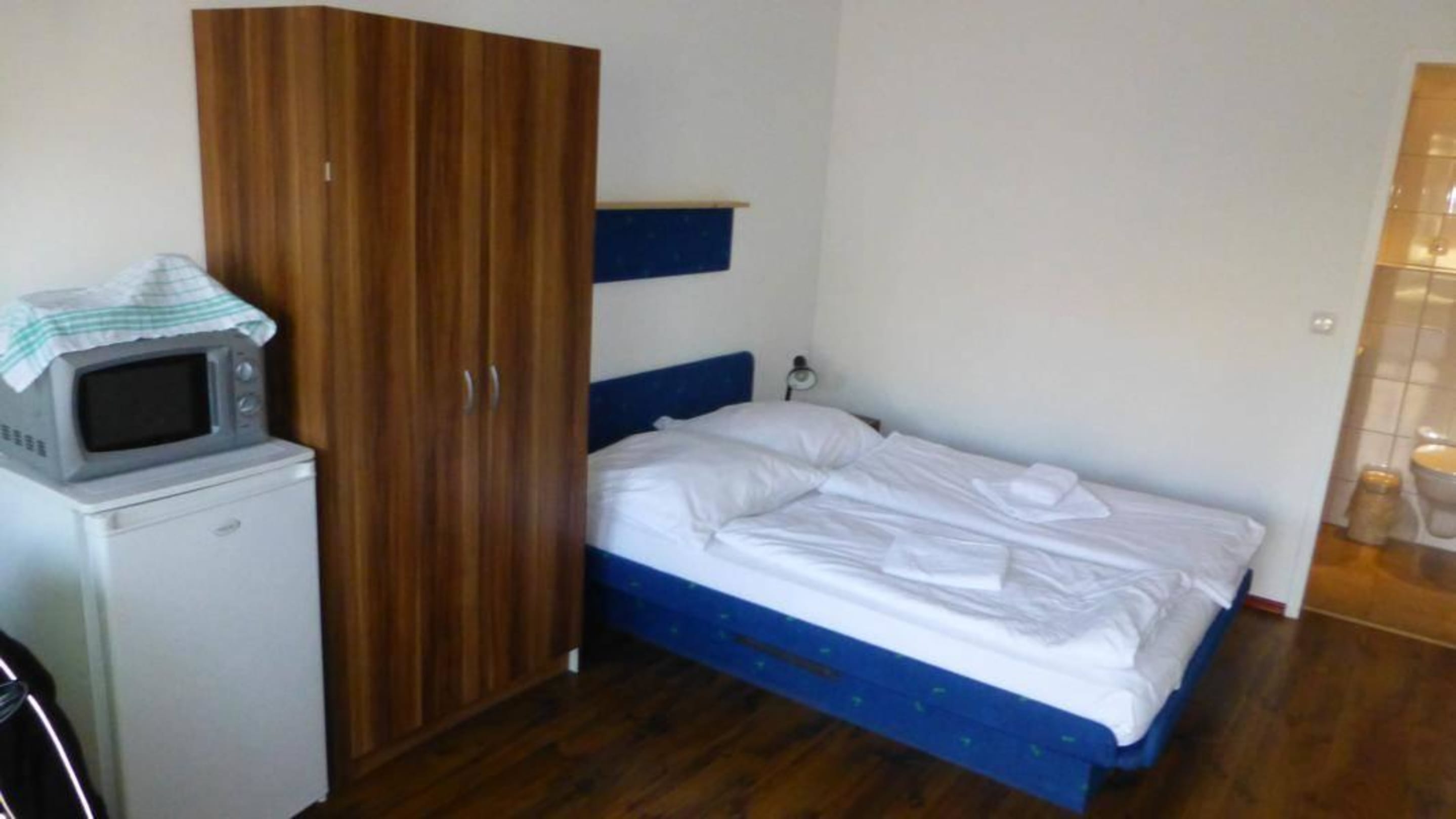 TV, Mikrowelle, Kühlschrank, Teller, Besteck und G