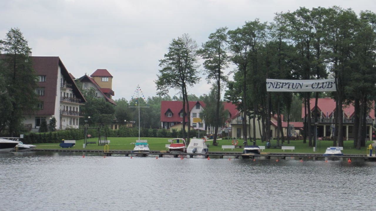 Blick vom Wasser auf den Neptun Club. Im Hintergrund, linksseitig, das Hotel Mazury.