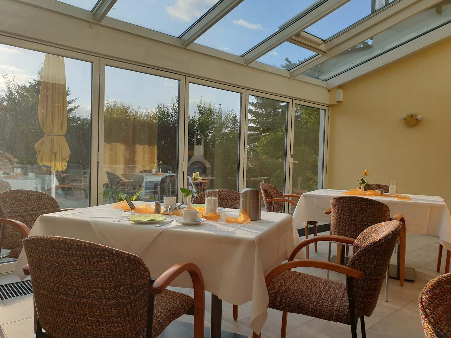Gaststätte mit Außenterrasse und Ausblick.