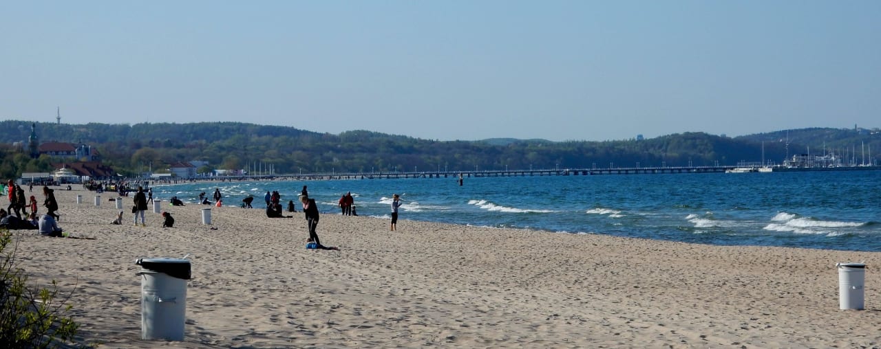 Strand mit langer Holzbrücke