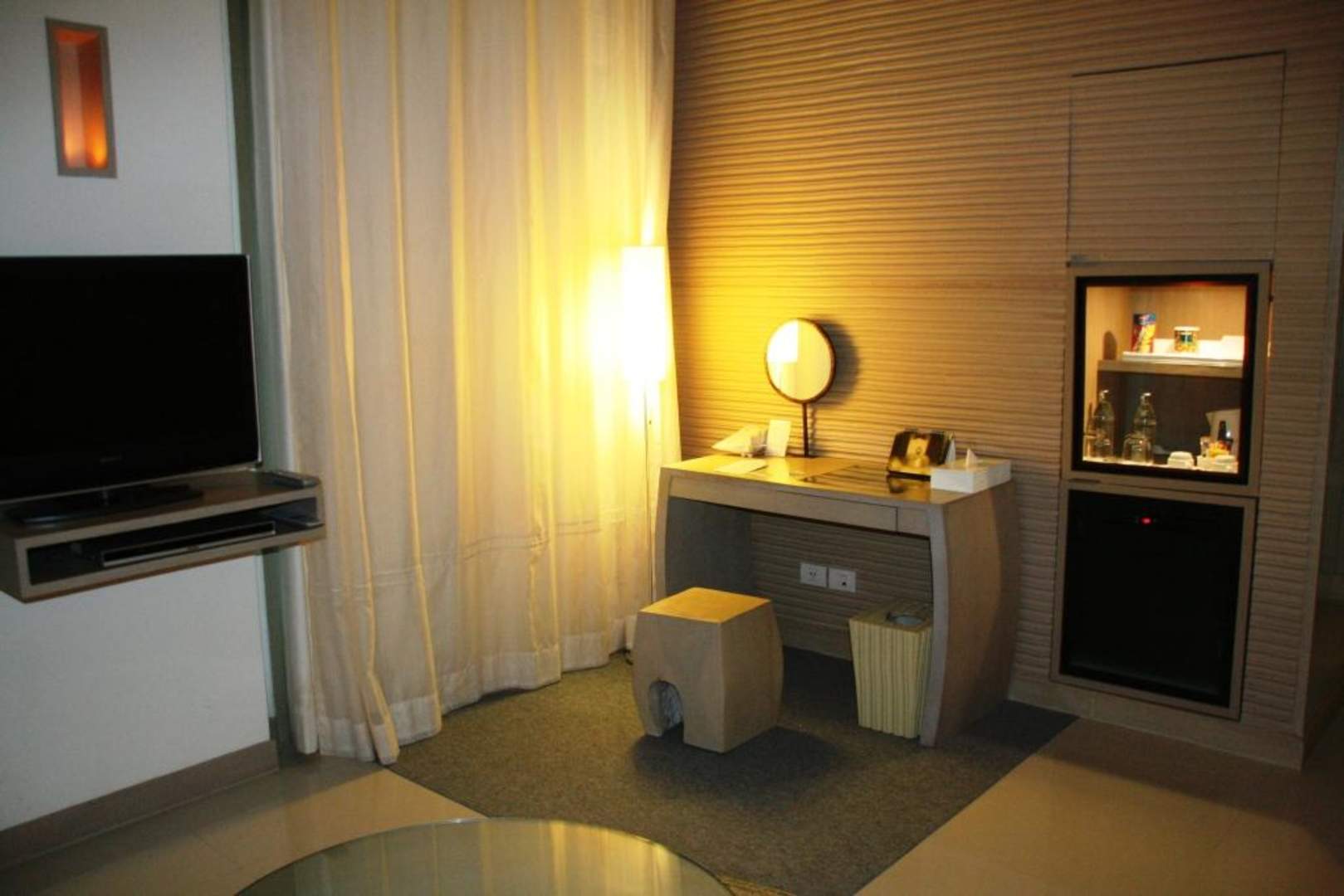 Schreibtisch, Kühlschrank, Fernseher