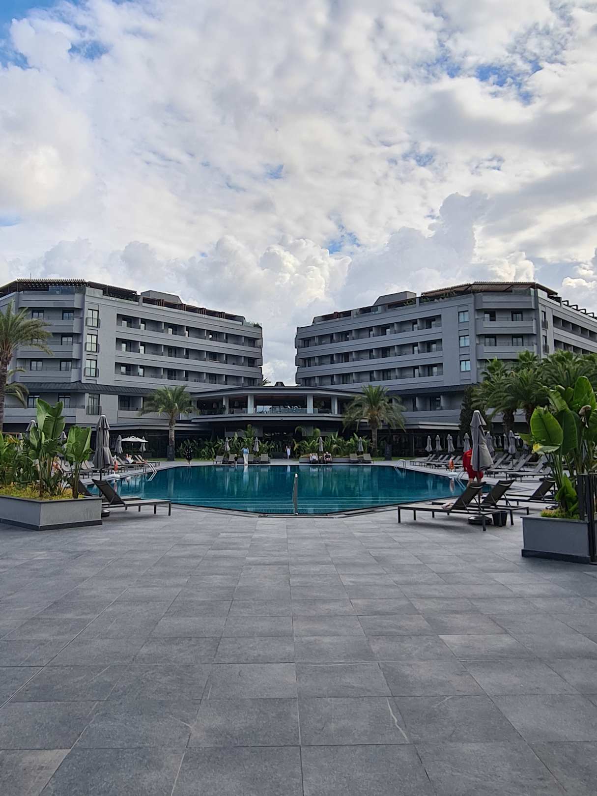 Ansicht vom Pool auf das Gebäude