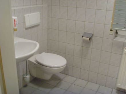 BadDas Bad im Hotel Mörike, ausgestattet mit Dusche, Waschbecken, WC, Seifenspender, Fön, Papierhandtüchern.